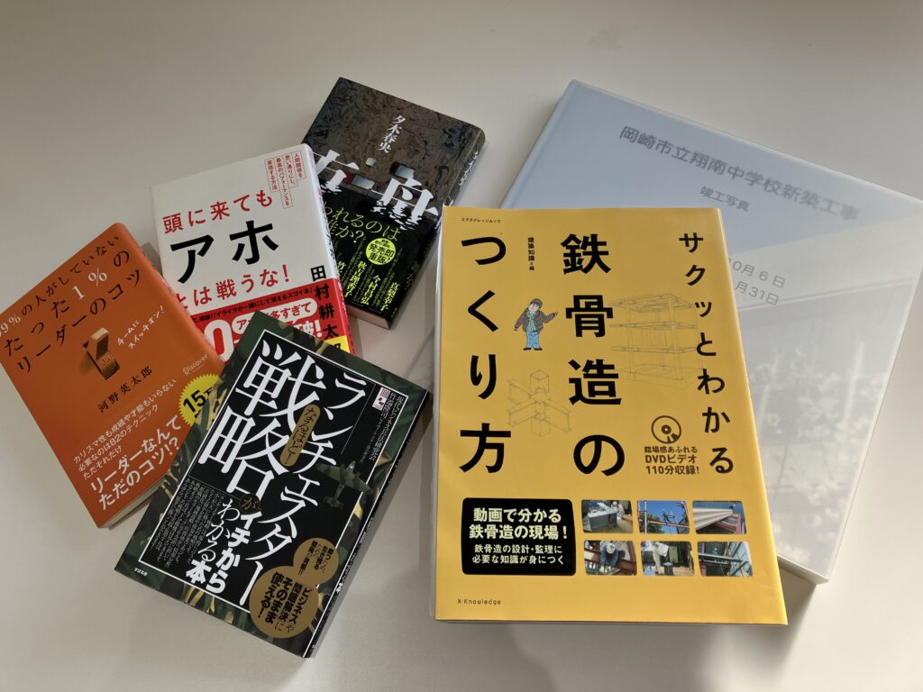また、建設会社の本棚らしく、過去の竣工写真や建築関連のテキストなどもあります。